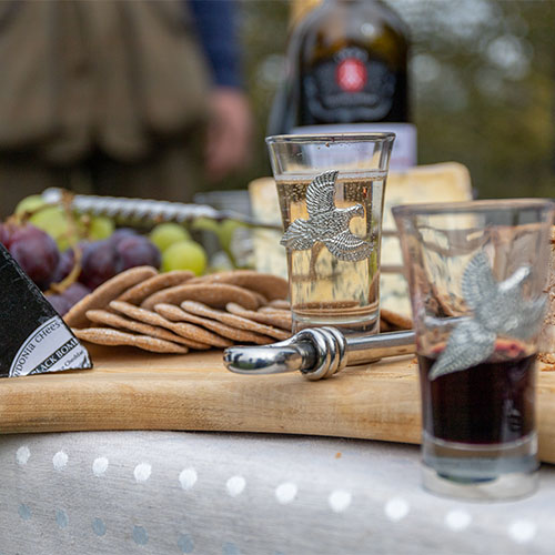 Rich brown leather 8oz Hunters Flask from Bisley featuring polished steel construction, hinged captive lid, and detailed stag or pheasant motif for country sports.